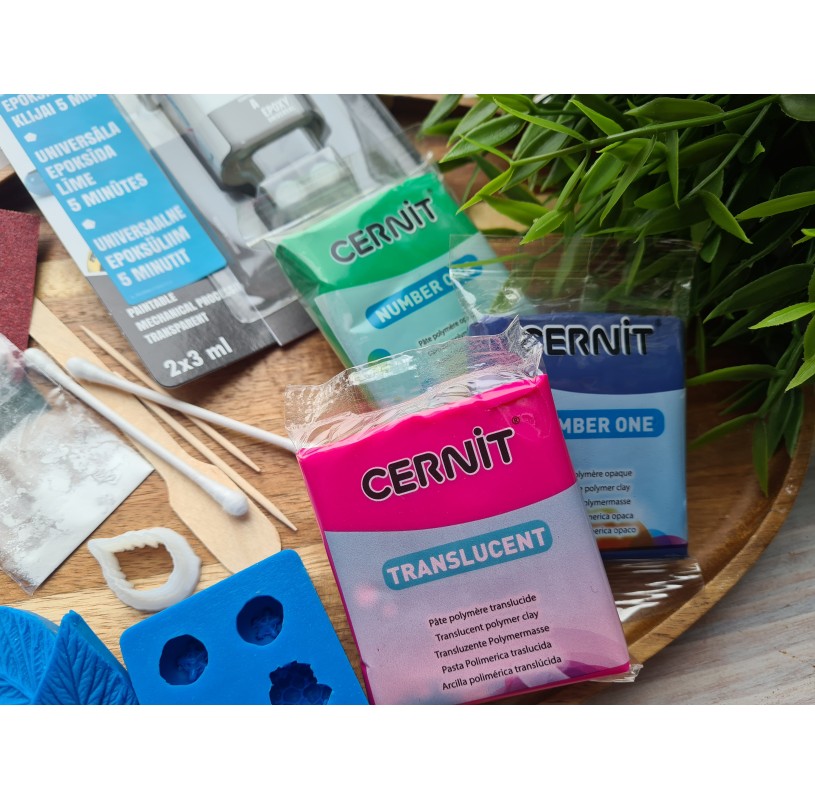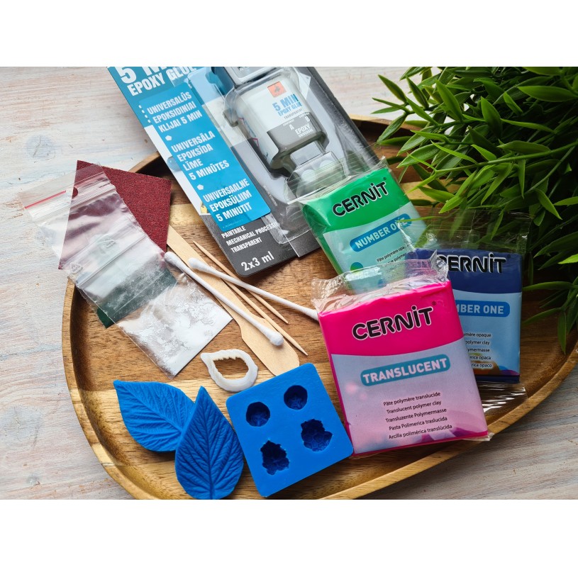 - 3 colors of polymer clay for baking berries and leaves - pink, blue and green.