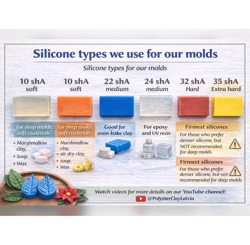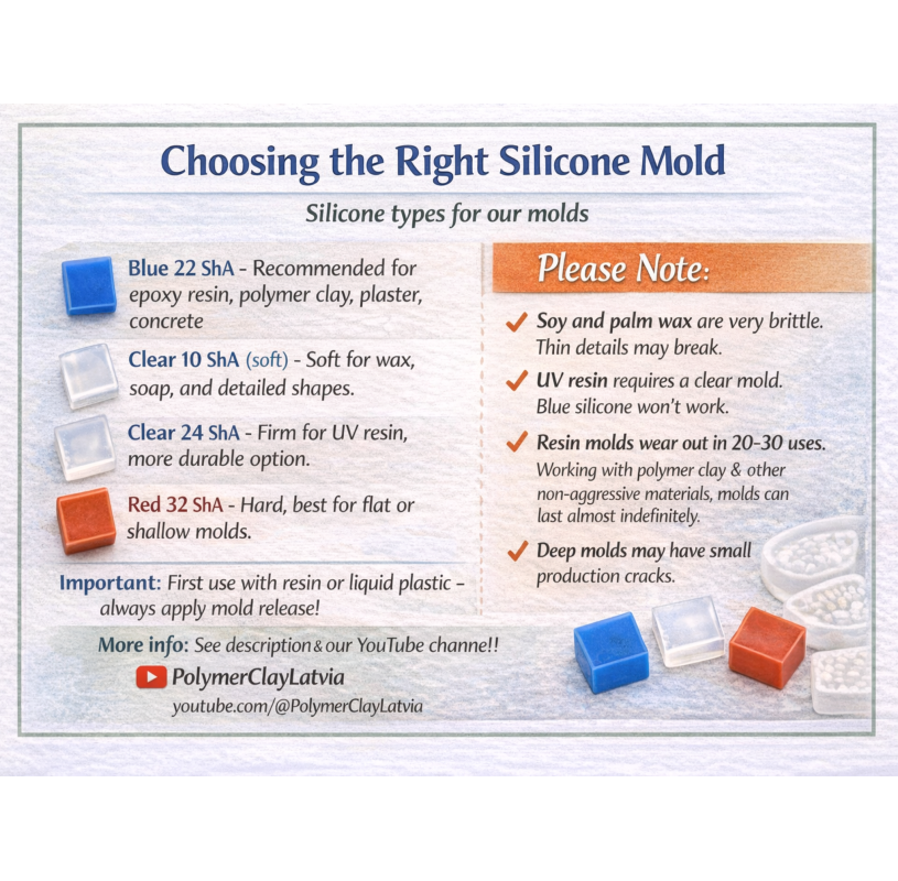 ℹ️ If a listing is offered only in transparent silicone, the mold is made in 10 ShA by default, as this hardness is most suitable for its shape and depth.