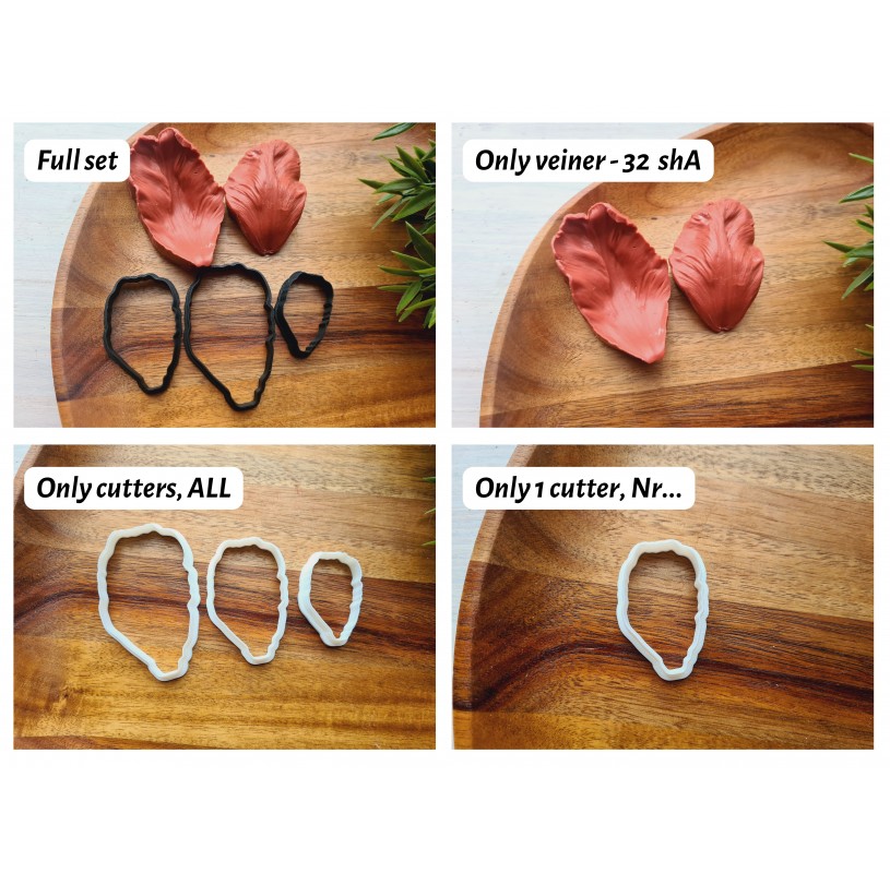Silicone veiners are petal or leaf impressions, that allow you to create petals and leaves with impressions on both sides. You just need to squeeze your working medium between 2 parts of silicone veiners to receive a fine impression. Plastic cutters help to cut the petal or leaves shape from the medium before texturizing it. Veiners are ideal to use for multi-modeling mediums such as polymer clay, pottery clay, air dry clay, metal clay, cold porcelain .